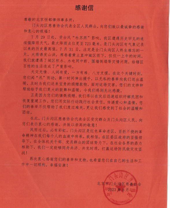 自7月29日起,在台风“杜苏芮”的影响下,北京市遭遇140年以来最大强降雨,此次洪水袭来致使北京市周边地区门头沟等区域造成严重损失。汛情发生后,党和政府高度重视,号召各行各业团结一致开展救灾工作。ag九游会j9集团律师事务所积极响应市司法局和市律协的号召履行社会责任,决心以实际行动帮助受灾区域重建家园。律所管委会及公益委经研究决定向红色革命老区门头沟区慈善协会捐赠善款五万元。定向用于门头沟区下清水村救灾和灾后重建。