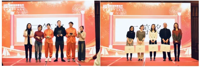 在欢声笑语中,抽奖环节将晚会气氛再次点燃。三等奖六名、二等奖四名的幸运儿们喜笑颜开,而金培荣律师更是抱得一等奖现金红包而归,将全场气氛推向又一个高潮。